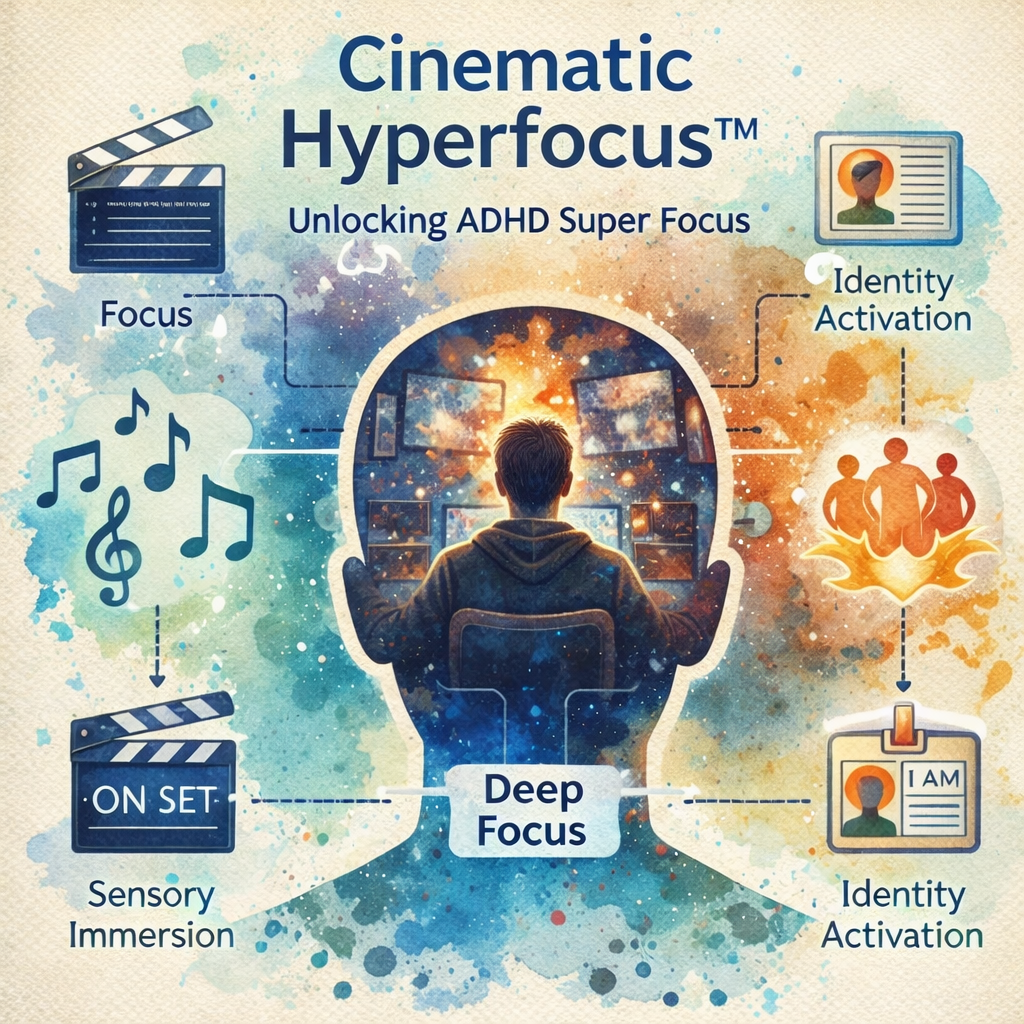 What Matters most - An ADHD Discourse Cinematic Hyperfocus™ — Rewriting the Rules of Attention For most of my life, I believed the same thing many people with ADHD are told—that focus was something I lacked. That it was unreliable, inconsistent, or simply broken. I tried the systems. The planners. The timers. The productivity hacks. Some worked… briefly. Most didn’t last. But something kept bothering me. There were moments—rare at first—when focus didn’t just show up, it took over. Hours disappeared. Energy increased. The work got done cleanly, decisively, sometimes brilliantly. And it never happened because I “tried harder.” It happened when something else clicked. Those moments felt cinematic. That observation became the beginning of a discovery that would eventually evolve into what I now call Cinematic Hyperfocus™—a method that doesn’t fight the ADHD brain, but speaks its language fluently. The Missing Conversation About ADHD Focus The dominant ADHD narrative treats attention as something to be controlled, constrained, or corrected. Focus is framed as discipline. As effort. As compliance. But the ADHD brain doesn’t respond well to abstraction or obligation. It responds to meaning, emotion, novelty, urgency, and identity. In short—it responds to story. This is the insight that most ADHD frameworks miss. When attention locks in, it’s not because the brain is obeying. It’s because the brain is engaged. Cinematic Hyperfocus™ reframes focus not as a motivation problem—but as a narrative alignment problem. What Is Cinematic Hyperfocus™? Cinematic Hyperfocus™ is a deliberate mental technique that uses imagery, emotional charge, sensory cues, and identity activation to induce deep, sustained focus. Instead of asking: “How do I force myself to do this?” The question becomes: “What scene am I stepping into right now?” When a task becomes part of an internal story—when it carries emotional weight and personal meaning—the ADHD brain stops resisting. Attention emerges naturally. This is not visualization for calm or positivity. This is visualization for execution. How the Method Works 1. Start With the Scene, Not the Task Traditional productivity begins with a checklist. Cinematic Hyperfocus™ begins with a moment. Ask yourself: If this were a movie, what scene is this? Who am I in this moment? What’s at stake? This reframes work as action instead of obligation. 2. Add Emotional Fuel Focus requires dopamine—but dopamine follows emotion. You intentionally attach the task to feelings like: Determination Confidence Resolve Redemption Mastery Emotion isn’t a bonus—it’s the ignition. 3. Lock In the Senses You anchor the scene with sensory cues: Music that evokes movement or intensity A physical posture that signals readiness A repeated phrase or cue that marks the start Over time, your nervous system learns the pattern: this means go. 4. Activate Identity You are not “trying to focus.” You are being someone already in motion. The strategist executing a plan. The craftsman finishing the work. The underdog refusing to stall. Identity collapses resistance faster than willpower ever could. 5. Ride the Wave Once hyperfocus engages, you don’t interrupt it. No time-checking. No self-evaluation. No perfectionism. You stay in the scene until the energy naturally tapers. The Benefits of Mastery When practiced consistently, Cinematic Hyperfocus™ can lead to: Faster task initiation Longer periods of deep focus Less burnout from forcing productivity Improved emotional regulation Restored confidence in your ability to work A sense of partnership with your brain instead of conflict Most importantly, it reframes ADHD not as a flaw—but as a responsive system that works brilliantly under the right conditions. An Honest Reality Check Cinematic Hyperfocus™ is not a magic switch. It does not work: 100% of the time When you’re severely exhausted When stress is overwhelming and unprocessed Without practice, you will struggle to make it work. Like any skill, it strengthens through repetition. Some days it engages instantly. Some days it takes longer. Some days it doesn’t show up at all—and that isn’t failure. It’s feedback. Consistency—not perfection—is what unlocks its full potential. Why This Matters No mainstream ADHD framework teaches people how to enter focus through story, emotion, and identity as a repeatable method. Cinematic Hyperfocus™ doesn’t demand that the ADHD brain change. It teaches you how to meet it where it already excels. Once you learn that language, attention stops being something you chase—and becomes something you can invite. Final Thought ADHD focus isn’t broken. It’s selective. Cinematic Hyperfocus™ is about learning how to become worthy of your brain’s full attention—on purpose.